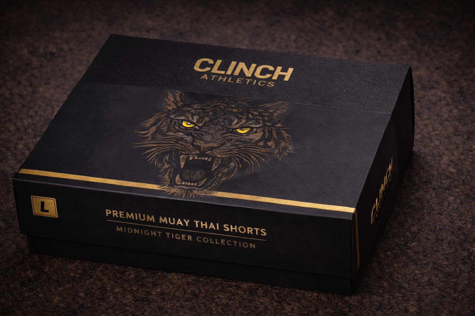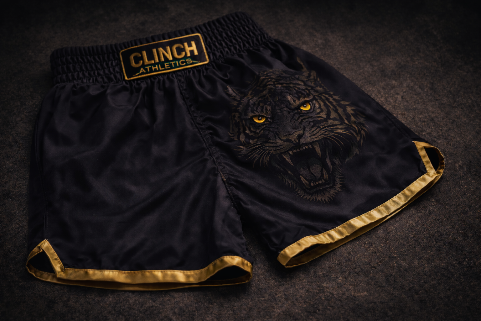 Dominate the ring with the Midnight Tiger Shorts, featuring a sleek black satin finish with striking gold tiger-stripe accents. Designed for fighters who demand both performance and style, these professional-grade Muay Thai shorts deliver unrestricted movement and premium comfort.